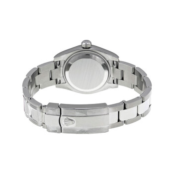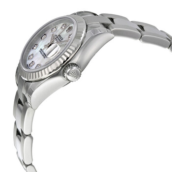 Stainless steel case with a stainless steel rolex oyster bracelet. Fixed - fluted 18k white gold bezel. Mother of pearl dial with silver-tone hands and diamond hour markers. Dial Type: Analog. Date display at the 3 o'clock position. Automatic movement. Scratch resistant sapphire crystal. Case diameter: 26 mm. Round case shape. Deployment with push button release clasp. Water resistant at 100 meters / 330 feet. Functions: date, hour, minute, second. Luxury watch style. Watch label: Swiss Made. Rolex Lady Datejust 26 Mother of Pearl Dial Stainless Steel Rolex Oyster Automatic Watch 179174MDO.