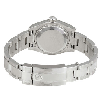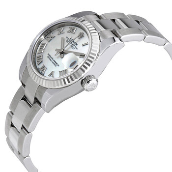 Stainless steel case with a stainless steel rolex oyster bracelet. Fixed - fluted 18k white gold bezel. Mother of pearl dial with silver-tone hands and Roman numeral hour markers. Dial Type: Analog. Date display at the 3 o'clock position. Automatic movement. Scratch resistant sapphire crystal. Screw down crown. Case diameter: 26 mm. Round case shape. Oyster clasp. Water resistant at 100 meters / 330 feet. Functions: date, hour, minute, second. Luxury watch style. Watch label: Swiss Made. Rolex Lady Datejust 26 Mother of Pearl Dial Stainless Steel Rolex Oyster Automatic Watch 179174MRO.