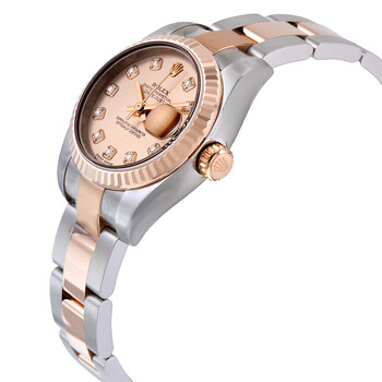 Stainless steel and 18k everose gold case with a stainless steel and 18k everose gold rolex oyster bracelet. Fixed - fluted 18k everose gold bezel. Pink dial with rose gold-tone hands and diamond hour markers. Dial Type: Analog. Date display at the 3 o'clock position. Automatic movement. Scratch resistant sapphire crystal. Screw down crown. Case diameter: 26 mm. Round case shape. Oyster clasp. Water resistant at 100 meters / 330 feet. Functions: date, hour, minute, second. Luxury watch style. Watch label: Swiss Made. Rolex Lady Datejust 26 Pink Dial Stainless Steel and 18K Everose Gold Rolex Oyster Automatic Watch 179171PDO.