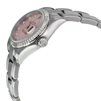 Stainless steel case with a stainless steel rolex oyster bracelet. Fixed - fluted 18k white gold bezel. Pink dial with silver-tone hands and diamond hour markers. Dial Type: Analog. Date display at the 3 o'clock position. Automatic movement. Scratch resistant sapphire crystal. Screw down crown. Case diameter: 26 mm. Round case shape. Oyster clasp. Water resistant at 100 meters / 330 feet. Functions: date, hour, minute, second. Luxury watch style. Watch label: Swiss Made. Rolex Lady Datejust 26 Pink Dial Stainless Steel Rolex Oyster Automatic Watch 179174PDO.