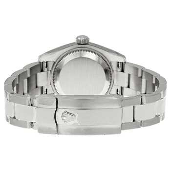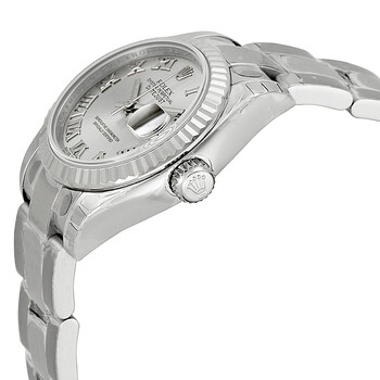 Stainless steel case with a stainless steel rolex oyster bracelet. Fixed - fluted 18k white gold bezel. Rhodium dial with silver-tone hands and Roman numeral hour markers. Minute markers around the outer rim. Dial Type: Analog. Date display at the 3 o'clock position. Automatic movement. Scratch resistant sapphire crystal. Screw down crown. Case diameter: 26 mm. Round case shape. Oyster clasp. Water resistant at 100 meters / 330 feet. Functions: date, hour, minute, second. Luxury watch style. Watch label: Swiss Made. Rolex Lady Datejust 26 Rhodium Dial Stainless Steel Rolex Oyster Automatic Watch 179174RRO.