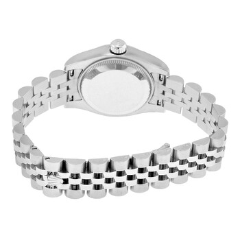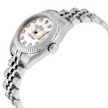 Stainless steel case with a stainless steel rolex jubilee bracelet. Fixed - fluted 18k white gold bezel. Silver dial with silver-tone hands and diamond hour markers. Dial Type: Analog. Date display at the 3 o'clock position. Automatic movement. Scratch resistant sapphire crystal. Screw down crown. Solid case back. Case diameter: 26 mm. Round case shape. Hidden deployment clasp. Water resistant at 100 meters / 330 feet. Functions: date, hour, minute, second. Luxury watch style. Watch label: Swiss Made. Item Variations: 179174, 179174-SDJ, Rolex-179174, Rolex-179174-SDJ. Rolex Lady Datejust 26 Silver Dial Stainless Steel Rolex Jubilee Automatic Watch 179174SDJ.