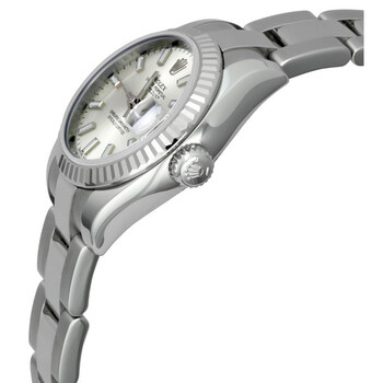 Stainless steel case with a stainless steel rolex oyster bracelet. Fixed - fluted 18k white gold bezel. Silver dial with silver-tone hands and luminous stick hour markers. Minute markers around the outer rim. Dial Type: Analog. Luminescent hands and dial markers. Date display at the 3 o'clock position. Automatic movement. Scratch resistant sapphire crystal. Case diameter: 26 mm. Round case shape. Water resistant at 100 meters / 330 feet. Functions: date, hour, minute, second. Luxury watch style. Watch label: Swiss Made. Rolex Lady Datejust 26 Silver Dial Stainless Steel Rolex Oyster Automatic Watch 179174SSO.