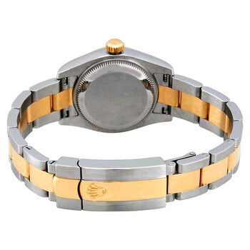 Stainless steel case with a stainless steel Rolex oyster bracelet with 18kt yellow gold center links. Fixed domed 18k yellow gold bezel. White dial with yellow gold-tone hands and Roman numeral hour markers. Minute markers around the outer rim. Dial Type: Analog. Date display at the 3 o'clock position. Rolex cxalibre 2235 automatic movement with a 48-hour power reserve. Scratch resistant sapphire crystal. Screw down crown. Solid case back. Round case shape. Case size: 26 mm. Oysterlock clasp. Water resistant at 100 meters / 330 feet. Functions: date, hour, minute, second, chronometer. Luxury watch style. Watch label: Swiss Made. Item Variations: 179163, 179163-WRO, Rolex-179163, Rolex-179163-WRO. Rolex Lady Datejust 26 White Dial Stainless Steel and 18K Yellow Gold Oyster Bracelet Automatic Watch 179163WRO.