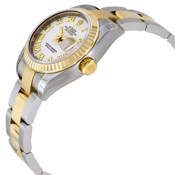 . Stainless steel case with a stainless steel Rolex oyster bracelet with 8kt yellow gold center links. Fixed fluted 18kt yellow gold bezel. White dial with yellow gold-tone hands and Roman numeral hour markers. Minute markers around the outer rim. Dial Type: Analog. Rolex calibre 2235 automatic movement with a 48-hour power reserve. Scratch resistant sapphire crystal. Screw down crown. Solid case back. Case size: 26 mm. Round case shape. Oysterlock clasp. Water resistant at 100 meters / 330 feet. Functions: date, hour, minute, second, chronometer. Luxury watch style. Watch label: Swiss Made. Rolex Lady Datejust 26 White Dial Stainless Steel and 18K Yellow Gold Rolex Oyster Automatic Watch 179173WRO.