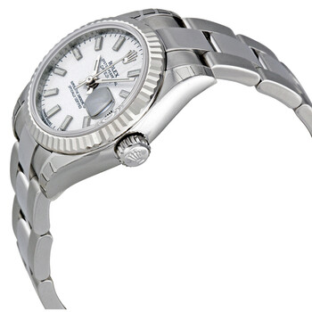 Stainless steel case with a stainless steel rolex oyster bracelet. Fixed - fluted 18k white gold bezel. White dial with silver-tone hands and stick hour markers. Minute markers around the outer rim. Dial Type: Analog. Luminescent hands and markers. Date display at the 3 o'clock position. Automatic movement. Scratch resistant sapphire crystal. Screw down crown. Case diameter: 26 mm. Round case shape. Oysterclasp clasp. Water resistant at 100 meters / 330 feet. Functions: date, hour, minute, second. Luxury watch style. Watch label: Swiss Made. Rolex Lady Datejust 26 White Dial Stainless Steel Rolex Oyster Automatic Watch 179174WSO.