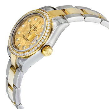 Stainless steel and 18k yellow gold case with a stainless steel and 18k yellow gold rolex oyster bracelet. Fixed - 18k yellow gold diamond-set bezel. Yellow gold dial with yellow gold-tone hands and diamond hour markers. Dial Type: Analog. Date display at the 3 o'clock position. Automatic movement. Scratch resistant sapphire crystal. Screw down crown. Case diameter: 26 mm. Round case shape. Oyster clasp. Water resistant at 100 meters / 330 feet. Functions: date, hour, minute, second. Luxury watch style. Watch label: Swiss Made. Rolex Lady Datejust 26 Yellow Gold Dial Stainless Steel and 18K Yellow Gold Rolex Oyster Automatic Watch 179383YGCDO.