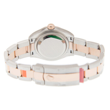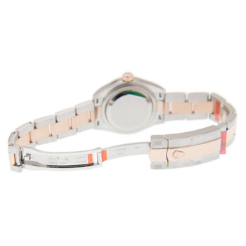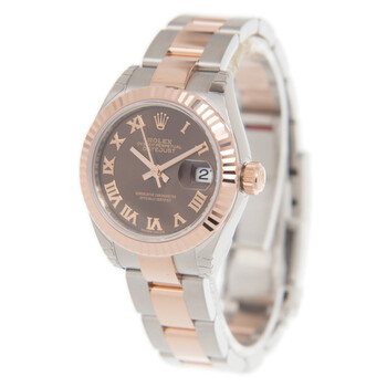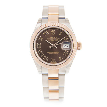 Silver-tone stainless steel case with a two-tone (silver-tone and rose gold-tone) stainless steel and 18kt everose gold rolex oyster bracelet. Fixed fluted rose gold-tone 18kt everose gold bezel. Brown dial with gold-tone hands and Arabic numeral hour markers. Dial Type: Analog. Date display at the 3 o'clock position. Rolex Calibre 2236 Automatic movement, based upon Rolex 2235, containing 31 Jewels, bitting at 28800 vph, and has a power reserve of approximately 55 hours. Scratch resistant sapphire crystal. Screw down crown. Solid case back. Round case shape, case size: 28 mm, case thickness: 11 mm. Crown clasp. Water resistant at 100 meters / 330 feet. Functions: date, hour, minute, second. Lady Datejust 28 Series. Luxury watch style. Watch label: Swiss Made. Rolex Lady Datejust 28 Automatic Brown Dial Ladies Watch 279171 BRRO.
