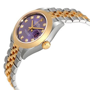 Silver-tone stainless steel case with a stainless steel Rolex jubilee bracelet with 18kt yellow gold center links. Fixed 18kt yellow gold bezel. Lavender dial with gold-tone hands and diamond hour markers. Dial Type: Analog. Date display at the 3 o'clock position. Rolex calibre 2236 automatic movement with a 55-hour power reserve. Scratch resistant sapphire crystal. Screw down crown. Solid case back. Case size: 28 mm. Round case shape. Concealed crown clasp. Water resistant at 100 meters / 330 feet. Functions: date, hour, minute, second. Luxury watch style. Watch label: Swiss Made. Rolex Lady Datejust 28 Lavender Dial Steel and 18k Yellow Gold Jubilee Watch 279163LVDJ.