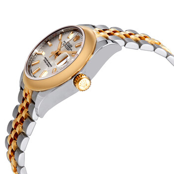 Stainless steel and 18k yellow gold case with a stainless steel and 18k yellow gold rolex jubilee bracelet. Fixed bezel. Silver dial with gold-tone hands and index hour markers. Dial Type: Analog. Date display at the 3 o'clock position. Rolex Calibre 2236 automatic movement with about 55 hours of power reserve. Scratch resistant sapphire crystal. Screw down crown. Solid case back. Case size: 28 mm. Round case shape. Water resistant at 100 meters / 330 feet. Functions: date, hour, minute, second. Luxury watch style. Watch label: Swiss Made. Rolex Lady Datejust 28 Silver Dial Steel and 18K Yellow Gold Jubilee Watch 279163SSJ.