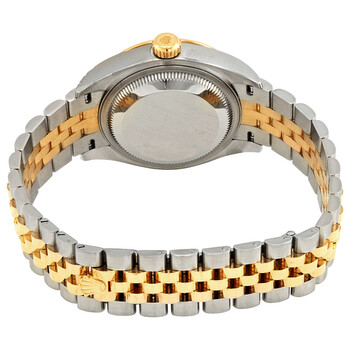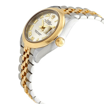 Stainless steel and 18k yellow gold case with a stainless steel and 18k yellow gold rolex jubilee bracelet. Fixed bezel. Silver dial with gold-tone hands and Roman numeral hour markers. Dial Type: Analog. Date display at the 3 o'clock position. Rolex Calibre 2236 automatic movement with about 55 hours of power reserve. Scratch resistant sapphire crystal. Screw down crown. Solid case back. Case size: 28 mm. Round case shape. Water resistant at 100 meters / 330 feet. Functions: date, hour, minute, second. Luxury watch style. Watch label: Swiss Made. Rolex Lady Datejust 28 Silver Dial Steel and 18K Yellow Gold Watch 279163SRJ.
