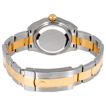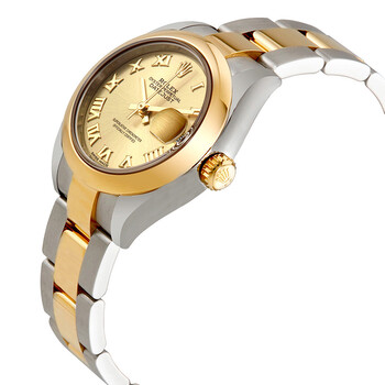 Stainless steel case with a stainless steel Rolex oyster bracelet with 18kt yellow gold center links. Fixed domed 18kt yellow gold bezel. Champagne dial with yellow gold-tone hands and Roman numeral hour markers. Dial Type: Analog. Date display at the 3 o'clock position. Rolex calibre 2236 automatic movement with a 55-hour power reserve. Scratch resistant sapphire crystal. Screw down crown. Solid case back. Round case shape. Case size: 28 mm. Oysterlock clasp. Water resistant at 100 meters / 330 feet. Functions: date, hour, minute, second. Luxury watch style. Watch label: Swiss Made. Rolex Lady Datejust 28 Steel and 18K Yellow Gold Watch 279163CRO.