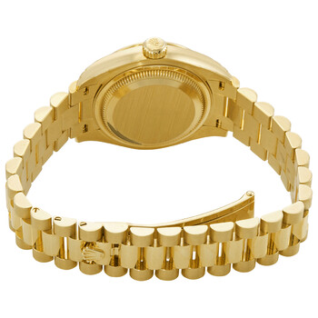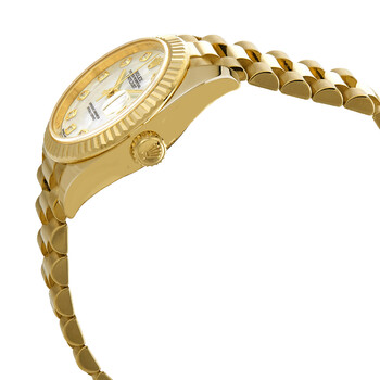 18kt yellow gold case with a 18kt yellow gold oyster bracelet. Fixed fluted 18kt yellow gold bezel. White mother of pearl dial with yellow gold hands and diamond hour markers. Dial Type: Analog. Date display at the 3 o'clock position. Rolex Calibre 2236 Automatic movement, based upon Rolex 2235, containing 31 Jewels, bitting at 28800 vph, and has a power reserve of approximately 55 hours. Scratch resistant sapphire crystal. Screw down crown. Solid case back. Round case shape. Case size: 28 mm. Concealed fold over crown clasp. Water resistant at 100 meters / 330 feet. Functions: date, hour, minute, second, chronometer. Lady Datejust Series. Luxury watch style. Watch label: Swiss Made. Rolex Lady Datejust Automatic Chronometer Diamond White Mother of Pearl Dial Ladies Watch 279178MDP.