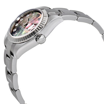 Stainless steel case with a stainless steel Rolex oyster bracelet. Fixed fluted 18kt white gold bezel. Black mother of pearl dial with silver-tone hands and diamond hour markers. Dial Type: Analog. Date display at the 3 o'clock position. Rolex calibre 2235 automatic movement with a 48-hour power reserve. Scratch resistant sapphire crystal. Screw down crown. Solid case back. Case size: 26 mm. Round case shape. Oysterlock clasp. Water resistant at 100 meters / 330 feet. Functions: date, hour, minute, second, chronometer. Luxury watch style. Watch label: Swiss Made. Rolex Lady Datejust Black Mother of Pearl Diamond Automatic Watch 179174BMDO.