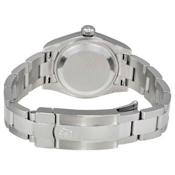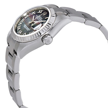 Stainless steel case with a stainless steel Rolex oyster bracelet. Fixed fluted silver-tone bezel. Black mother of pearl dial with silver-tone hands and Roman numeral hour markers. Dial Type: Analog. Date display at the 3 o'clock position. Rolex calibre 2235 automatic movement with a 48-hour power reserve. Scratch resistant sapphire crystal. Screw down crown. Solid case back. Case size: 26 mm. Round case shape. Oysterlock clasp. Water resistant at 100 meters / 330 feet. Functions: date, hour, minute, second, chronometer. Luxury watch style. Watch label: Swiss Made. Rolex Lady Datejust Black Mother of Pearl Roman Dial Automatic Watch 179174BMRO.