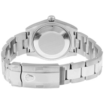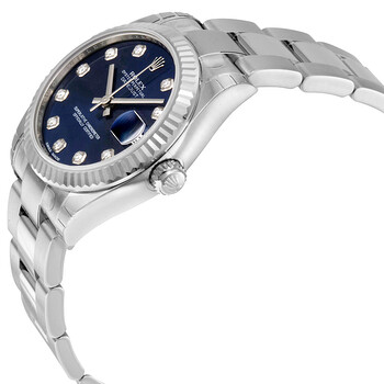 Stainless steel case with a stainless steel Rolex Oyster bracelet. Fixed fluted 18kt white gold bezel. Blue dial with silver-tone hands and diamond hour markers. Dial Type: Analog. Date display at the 3 o'clock position. Automatic movement with a 48-hour power reserve. Scratch resistant sapphire crystal. Screw down crown. Solid case back. Case size: 31 mm. Round case shape. Oysterlock clasp. Water resistant at 100 meters / 330 feet. Functions: date, hour, minute, second. Luxury watch style. Watch label: Swiss Made. Rolex Lady Datejust Blue Diamond Dial Steel and 18K White Gold Oyster Watch 178274BLDO.