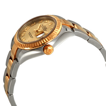 Stainless steel case with a stainless steel and 18kt yellow gold rolex oyster bracelet. Fixed fluted gold bezel. Champagne dial with gold-tone hands and Roman numeral hour markers. Dial Type: Analog. Date display at the 3 o'clock position. Rolex Calibre 2236 automatic movement with a 55-hour power reserve. Scratch resistant sapphire crystal. Screw down crown. Solid case back. Round case shape. Case size: 28 mm. Concealed crown clasp. Water resistant at 100 meters / 330 feet. Functions: date, hour, minute, second, chronometer. Luxury watch style. Watch label: Swiss Made. Rolex Lady Datejust Champagne Dial Ladies Steel and 18kt Yellow Gold Oyster Watch 279173CRO.