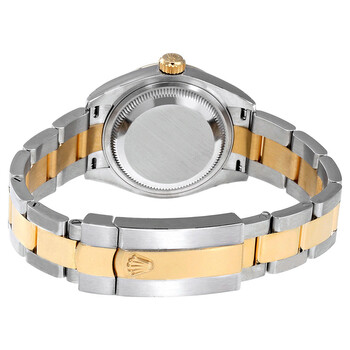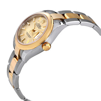 Stainless steel and 18k yellow gold case with a stainless steel and 18k yellow gold Rolex Oyster bracelet. Fixed - domed 18k yellow gold bezel. Champagne dial with yellow gold-tone hands and index hour markers. Minute markers around the outer rim. Dial Type: Analog. Date display at the 3 o'clock position. Rolex Calibre 2236 automatic movement with about 55 hours of power reserve. Scratch resistant sapphire crystal. Screw down crown. Solid case back. Case size: 28 mm. Round case shape. Oysterlock clasp. Water resistant at 100 meters / 330 feet. Functions: date, hour, minute, second. Luxury watch style. Watch label: Swiss Made. Rolex Lady Datejust Champagne Dial Steel and 18K Yellow Gold Oyster Watch 279163CSO.
