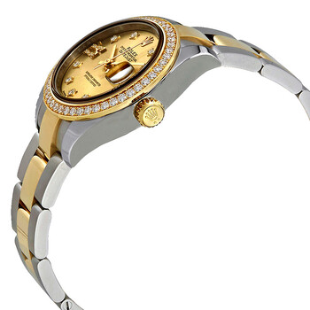 Stainless steel and 18k yellow gold case with a stainless steel and 18k yellow gold Rolex Oyster bracelet. Fixed, diamond-set bezel. Champagne dial with yellow gold-tone hands and diamond, Roman numeral hour markers. Dial Type: Analog. Date display at the 3 o'clock position. Automatic movement. Scratch resistant sapphire crystal. Solid case back. Case size: 28 mm. Round case shape. Concealed crown clasp. Water resistant at 100 meters / 330 feet. Functions: date, hour, minute, second. Luxury watch style. Watch label: Swiss Made. Rolex Lady Datejust Champagne Roman Diamond Dial Automatic Watch 279383CDRO.