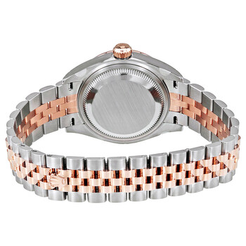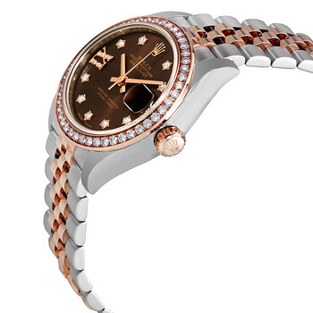 Stainless steel case with a stainless steel Rolex jubilee bracelet with 18kt everose gold center links. Fixed 18kt everose gold bezel set with diamonds. Champagne dial with everose gold-tone hands and diamond hour markers. Diamond-filled Roman numeral IX. Dial Type: Analog. Date display at the 3 o'clock position. Rolex calibre 2236 automatic movement, based upon Rolex 2235, containing 31 Jewels, bitting at 28800 vph, and has a power reserve of approximately 55 hours. Scratch resistant sapphire crystal. Screw down crown. Solid case back. Round case shape. Case size: 28 mm. Concealed crown clasp. Water resistant at 100 meters / 330 feet. Functions: date, hour, minute, second, chronometer. Lady Datejust Series. Luxury watch style. Watch label: Swiss Made. Rolex Lady Datejust Chocolate Brown Diamond Dial Automatic Watch 279381CHRDJ.
