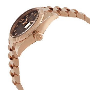 18k everose gold case with a 18k everose gold Rolex President bracelet. Fixed - fluted 18k everose gold bezel. Chocolate dial with rose gold-tone hands and 9 diamond hour markers. Diamond filled roman numeral VI. Dial Type: Analog. Date display at the 3 o'clock position. Rolex Calibre 2236 automatic movement with about 55 hours of power reserve. Scratch resistant sapphire crystal. Screw down crown. Case size: 28 mm. Round case shape. Concealed crown clasp. Water resistant at 100 meters / 330 feet. Functions: date, hour, minute, second. Luxury watch style. Watch label: Swiss Made. Rolex Lady Datejust Chocolate Dial 18K Everose Gold Diamond Automatic Watch 279175CHRDP.