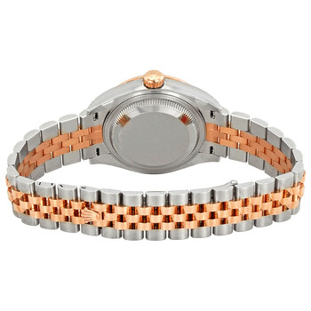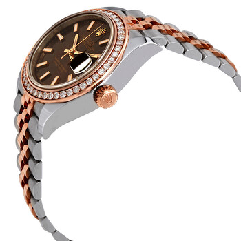 Stainless steel case with a stainless steel Rolex jubilee bracelet with 18kt everose gold center links. Fixed 18kt everose gold bezel set with diamonds. Chocolate dial with luminous everose gold hands and index hour markers. Minute markers around the outer rim. Dial Type: Analog. Luminescent hands and markers. Date display at the 3 o'clock position. Rolex calibre 2236 automatic movement with a 55-hour power reserve. Scratch resistant sapphire crystal. Screw down crown. Solid case back. Round case shape. Case size: 28 mm. Water resistant at 100 meters / 330 feet. Functions: date, hour, minute, second. Luxury watch style. Watch label: Swiss Made. Rolex Lady Datejust Chocolate Dial Automatic Ladies Steel and 18K Everose Gold Jubilee Watch 279381CHSJ.