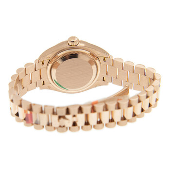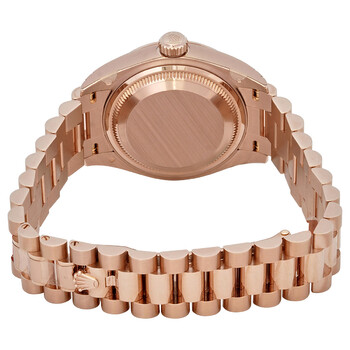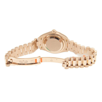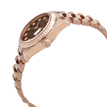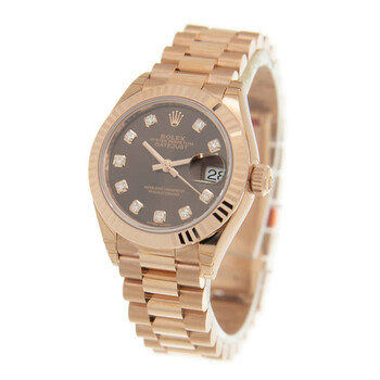 18kt rose gold case with a 18kt rose gold President bracelet. Fixed fluted 18kt rose gold bezel. Chocolate dial with rose gold-tone hands and diamond hour markers. Dial Type: Analog. Date display at the 3 o'clock position. Rolex calibre 2236 automatic movement, based upon Rolex 2235, containing 31 Jewels, bitting at 28800 vph, and has a power reserve of approximately 55 hours. Scratch resistant sapphire crystal. Screw down crown. Solid case back. Round case shape. Case size: 28 mm. Concealed fold over clasp. Water resistant at 100 meters / 330 feet. Functions: date, hour, minute, second. Lady Datejust Series. Luxury watch style. Watch label: Swiss Made. Item Variations: m279175-0016, 279175-0016. Rolex Lady Datejust Chocolate Diamond Dial Automatic 18 Carat Rose Gold President Watch 279175CHDP.
