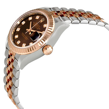 Stainless steel case with a stainless steel Rolex jubilee bracelet with 18kt everose gold center links. Fixed fluted 18kt everose gold bezel. Chocolate dial with rose gold-tone hands and diamond hour markers. Dial Type: Analog. Date display at the 3 o'clock position. Rolex calibre 2236 automatic movement with a 55-hour power reserve. Scratch resistant sapphire crystal. Screw down crown. Solid case back. Case size: 28 mm. Round case shape. Concealed crown clasp. Water resistant at 100 meters / 330 feet. Functions: date, hour, minute, second, chronometer. Luxury watch style. Watch label: Swiss Made. Rolex Lady Datejust Chocolate Diamond Dial Automatic Ladies Watch 279171CHDJ.