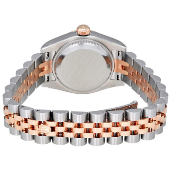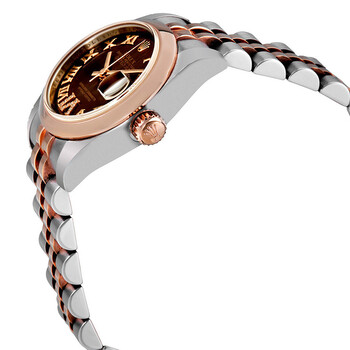 Stainless steel and 18kt rose gold case with a stainless steel and 18kt rose gold bracelet. Fixed, domed 18k rose gold bezel. Chocolate dial with rose gold-tone hands and Roman numeral hour markers. Diamond-filled roman numeral vi. Dial Type: Analog. Date display at the 3 o'clock position. Automatic movement. Scratch resistant sapphire crystal. Screw down crown. Solid case back. Case size: 26 mm. Round case shape. Concealed crown clasp. Water resistant at 100 meters / 330 feet. Functions: date, hour, minute, second. Luxury watch style. Watch label: Swiss Made. Rolex Lady Datejust Chocolate Diamond Dial Automatic Watch 179161CHRDJ.