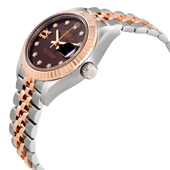 Stainless steel case with a stainless steel Rolex jubilee bracelet with 18kt everose gold center links. Fixed fluted 18k everose gold bezel. Chocolate dial with rose gold-tone hands and diamond hour markers. Diamond-set Roman numeral appears at the 9 o'clock position. Minute markers around the outer rim. Dial Type: Analog. Date display at the 3 o'clock position. Automatic movement with a 55-hour power reserve. Scratch resistant sapphire crystal. Screw down crown. Solid case back. Case size: 28 mm. Round case shape. Concealed crown clasp. Water resistant at 100 meters / 330 feet. Functions: date, hour, minute, second. Luxury watch style. Watch label: Swiss Made. Rolex Lady Datejust Chocolate Diamond Dial Automatic Watch 279171CHDRJ.