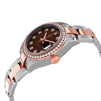 Stainless steel case with a stainless steel and 18ct everose gold rolex oyster bracelet. Fixed, diamond set everose gold bezel. Chocolate dial with everose gold hands and diamonds hour markers. Dial Type: Analog. Date display at the 3 o'clock position. Rolex Calibre 2236 automatic movement with a 55-hour power reserve. Scratch resistant sapphire crystal. Screw down crown. Solid case back. Round case shape. Case size: 28 mm. Water resistant at 100 meters / 330 feet. Functions: date, hour, minute, second. Luxury watch style. Watch label: Swiss Made. Rolex Lady Datejust Chocolate Diamond Dial Ladies Steel and 18ct Everose Gold Watch 279381CHDO.