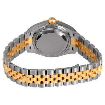 Silver-tone stainless steel case with a two-tone (silver-tone and gold-tone) stainless steel and 18kt yellow gold rolex oyster bracelet. Fixed fluted 18kt yellow gold bezel. Mint green dial with yellow gold-tone hands and diamond hour markers. Dial Type: Analog. Date display at the 3 o'clock position. Rolex Calibre 2236 Automatic movement, based upon Rolex 2235, containing 31 Jewels, bitting at 28800 vph, and has a power reserve of approximately 55 hours. Scratch resistant sapphire crystal. Screw down crown. Solid case back. Round case shape, case size: 28 mm. Oysterlock clasp. Water resistant at 100 meters / 330 feet. Functions: date, hour, minute, second, chronometer. Lady Datejust Series. Luxury watch style. Watch label: Swiss Made. Rolex Lady Datejust Mint Green Diamond Dial Automatic Watch 279173GNDO.