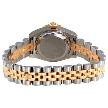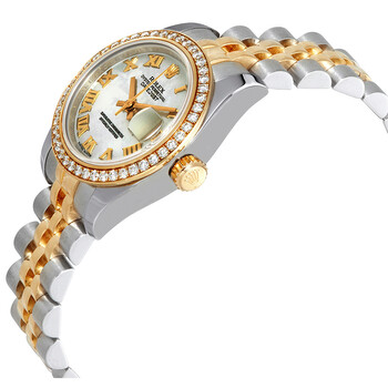 Stainless steel and 18kt yellow gold case with a two-tone (silver-tone and yellow gold-tone) stainless steel and 18k yellow gold rolex jubilee bracelet. Fixed 18kt yellow gold diamond set bezel. Mother of pearl dial with yellow gold-tone hands and Roman numeral hour markers. Dial Type: Analog. Date display at the 3 o'clock position. Rolex Calibre 2235 Automatic movement, containing 31 Jewels, bitting at 28800 vph, and has a power reserve of approximately 48 hours. Scratch resistant sapphire crystal. Screw down crown. Solid case back. Round case shape. Case size: 26 mm. Concealed crown clasp. Water resistant at 100 meters / 330 feet. Functions: date, hour, minute, second, chronometer. Luxury watch style. Watch label: Swiss Made. Rolex Lady Datejust Mother of Pearl Dial Automatic Watch 179383MRJ.
