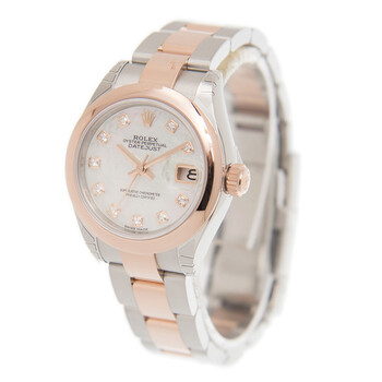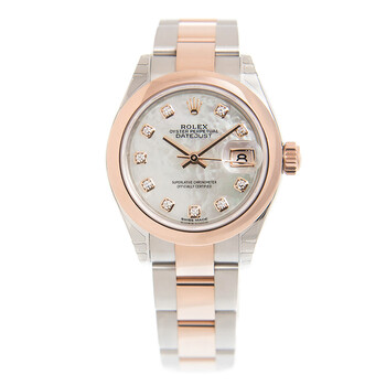Stainless steel and 18k everose gold case with a stainless steel and 18k everose gold Rolex Oyster bracelet. Fixed - domed 18k everose gold bezel. Mother of pearl dial with rose gold-tone hands and diamond hour markers. Dial Type: Analog. Date display at the 3 o'clock position. Automatic movement. Scratch resistant sapphire crystal. Screw down crown. Solid case back. Case size: 28 mm. Round case shape. Oysterlock clasp. Water resistant at 100 meters / 330 feet. Functions: date, hour, minute, second. Luxury watch style. Watch label: Swiss Made. Rolex Lady Datejust Mother of Pearl Diamond Oyster Watch 279161MDO.