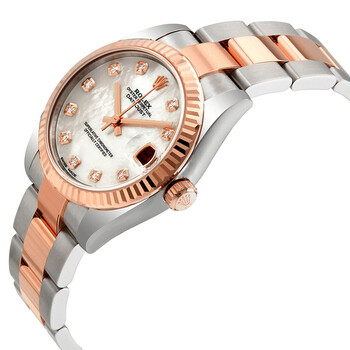 Stainless steel case with a stainless steel Rolex oyster bracelet with 18kt everose gold center links. Fixed fluted 18kt everose gold bezel. Mother of pearl dial with rose gold-tone hands and diamond hour markers. Dial Type: Analog. Date display at the 3 o'clock position. Rolex calibre 2235 automatic movement with a 48-hour power reserve. Scratch resistant sapphire crystal. Screw down crown. Solid case back. Case size: 31 mm. Round case shape. Oysterlock clasp. Water resistant at 100 meters / 330 feet. Functions: date, hour, minute, second, chronometer. Luxury watch style. Watch label: Swiss Made. Rolex Lady Datejust Mother of Pearl Diamond Stainless Steel and 18K Everose Gold 178271MDO.