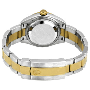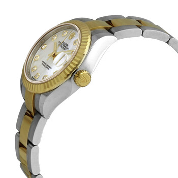 Stainless steel case with a stainless steel Rolex oyster bracelet with 18kt yellow gold center links. Fixed domed 18kt yellow gold bezel. Mother of pearl dial with yellow gold hands and diamond hour markers. Dial Type: Analog. Date display at the 3 o'clock position. Rolex calibre 2236 automatic movement, based upon Rolex 2235, containing 31 Jewels, bitting at 28800 vph, and has a power reserve of approximately 55 hours. Scratch resistant sapphire crystal. Screw down crown. Solid case back. Round case shape. Case size: 28 mm. Oysterlock clasp. Water resistant at 100 meters / 330 feet. Functions: date, hour, minute, second, chronometer. Lady Datejust Series. Luxury watch style. Watch label: Swiss Made. Rolex Lady Datejust Mother of Pearl Diamond Steel and 18K Yellow Gold Oyster Watch 279173MDO.