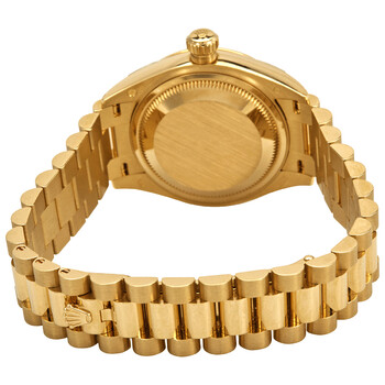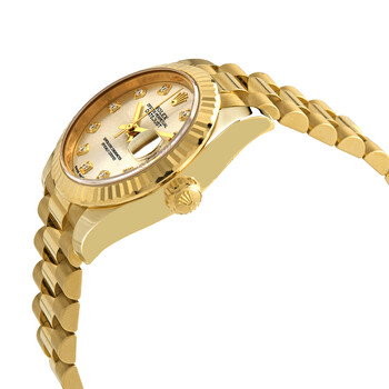 18kt yellow gold case with a 18kt yellow gold president bracelet. Fluted 18kt yellow gold bezel. Silver dial with yellow gold hands and diamond hour markers. Dial Type: Analog. Date display at the 3 o'clock position. Rolex calibre 2236 automatic movement, based upon Rolex 2235, containing 31 Jewels, bitting at 28800 vph, and has a power reserve of approximately 55 hours. Scratch resistant sapphire crystal. Screw down crown. Solid case back. Round case shape. Case size: 28 mm. Concealed fold over crown clasp. Water resistant at 100 meters / 330 feet. Functions: date, hour, minute, second. Lady Datejust Series. Luxury watch style. Watch label: Swiss Made. Rolex Lady Datejust Silver Diamond Dial Automatic 18 Carat Yellow Gold President Watch 279178.