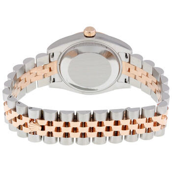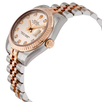 Stainless steel case with a stainless steel Rolex jubile bracelet with 18kt everose gold center links. Fixed fluted 18kt everose gold bezel. Silver with diamond markers dial with rose gold hands and diamond hour markers. Dial Type: Analog. Date display at the 3 o'clock position. Rolex calibre 2235 automatic movement with a 48-hour power reserve. Scratch resistant sapphire crystal. Screw down crown. Solid case back. Case size: 31 mm. Round case shape. Concealed crown clasp. Water resistant at 100 meters / 330 feet. Functions: date, hour, minute, second, chronometer. Luxury watch style. Watch label: Swiss Made. Item Variations: 178271-63161. Rolex Lady Datejust Silver Diamond Dial Steel and 18K Everose Gold Jubilee Watch 178271SDJ.