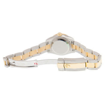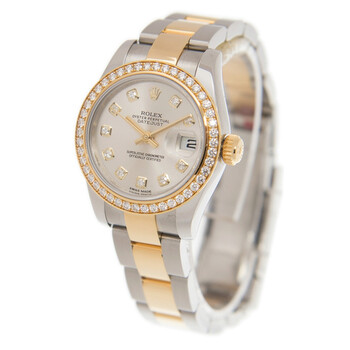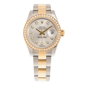 Stainless steel and 18kt yellow gold case with a two-tone (silver-tone and yellow gold-tone) stainless steel and 18kt yellow gold rolex oyster bracelet. Fixed 18kt yellow gold diamond set bezel. Silver dial with yellow gold-tone hands and diamond hour markers. Minute markers around the outer rim. Dial Type: Analog. Date display at the 3 o'clock position. Rolex Calibre 2235 Automatic movement, containing 31 Jewels, bitting at 28800 vph, and has a power reserve of approximately 48 hours. Scratch resistant sapphire crystal. Screw down crown. Solid case back. Round case shape. Case size: 26 mm. Oyster clasp. Water resistant at 100 meters / 330 feet. Functions: date, hour, minute, second, chronometer. Luxury watch style. Watch label: Swiss Made. Rolex Lady Datejust Silver Diamond Dial Steel and 18K Yellow Gold Automatic Watch 179383SDO.