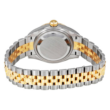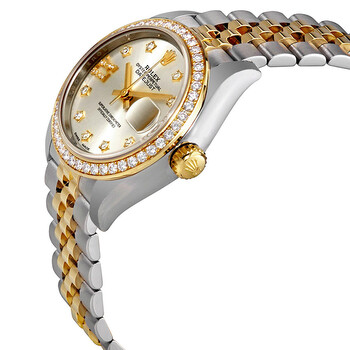 Stainless steel case with a stainless steel Rolex jubilee bracelet with 18kt yellow gold center links. Fixed 18kt yellow gold set with diamonds bezel. Silver dial with yellow gold-tone hands and Roman numeral hour markers. Diamond-filled Roman numeral appears at the 9 o'clock position. Dial Type: Analog. Date display at the 3 o'clock position. Rolex calibre 2236 automatic movement, based upon Rolex 2235, containing 31 Jewels, bitting at 28800 vph, and has a power reserve of approximately 55 hours. Scratch resistant sapphire crystal. Screw down crown. Solid case back. Round case shape. Case size: 28 mm. Concealed crown clasp. Water resistant at 100 meters / 330 feet. Functions: date, hour, minute, second, chronometer. Lady Datejust Series. Luxury watch style. Watch label: Swiss Made. Item Variations: 279383-63343. Rolex Lady Datejust Silver Roman Diamond Dial Automatic Watch 279383SRDJ.