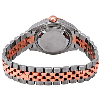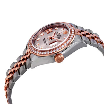 Stainless steel case with a stainless steel and 18ct everose gold rolex jubile bracelet. Fixed- diamond set everose gold bezel. Sundust dial with everose gold hands and diamonds and Roman numeral at the 9 o' clock hour markers. Dial Type: Analog. Date display at the 3 o'clock position. Rolex Calibre 2236 automatic movement with a 55-hour power reserve. Scratch resistant sapphire crystal. Screw down crown. Solid case back. Round case shape. Case size: 28 mm. Water resistant at 100 meters / 330 feet. Functions: date, hour, minute, second. Luxury watch style. Watch label: Swiss Made. Rolex Lady Datejust Sundust Diamond Dial Ladies Steel and 18ct Everose Gold Jubile Watch 279381SNRDJ.