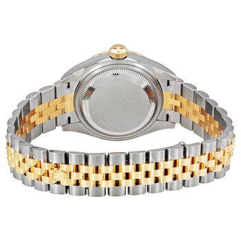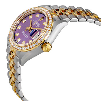 Stainless steel case with a stainless steel Rolex jubilee bracelet with 18kt yellow gold center links. Fixed 18kt yellow gold bezel set with diamonds. Violet stripe motif dial with yellow gold-tone hands and diamond hour markers. Dial Type: Analog. Date display at the 3 o'clock position. Rolex calibre 2236 automatic movement, based upon Rolex 2235, containing 31 Jewels, bitting at 28800 vph, and has a power reserve of approximately 55 hours. Scratch resistant sapphire crystal. Screw down crown. Solid case back. Round case shape. Case size: 28 mm. Concealed crown clasp. Water resistant at 100 meters / 330 feet. Functions: date, hour, minute, second, chronometer. Lady Datejust Series. Luxury watch style. Watch label: Swiss Made. Item Variations: 279383-63343. Rolex Lady Datejust Violet Stripe Diamond Dial Automatic Ladies Watch 279383VDJ.