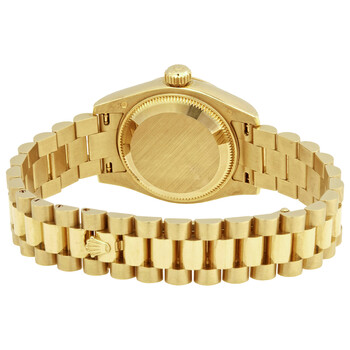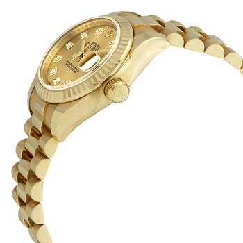 18k yellow gold case with a 18k yellow gold Rolex President bracelet. Fixed - fluted 18k yellow gold bezel. Gold dial with yellow gold-tone hands and diamond hour markers. Dial Type: Analog. Date display at the 3 o'clock position. Automatic movement. Scratch resistant sapphire crystal. Screw down crown. Solid case back. Case diameter: 26 mm. Round case shape. Concealed Crown clasp. Water resistant at 100 meters / 330 feet. Functions: date, hour, minute, second. Luxury watch style. Watch label: Swiss Made. Item Variations: 179178PCDD, Rolex-179178PCDD 179178, 179178-CDP, Rolex-179178, Rolex-179178-CDP. Rolex Lady-Datejust 26 Gold Dial 18K Yellow Gold President Automatic Ladies Diamond Watch 179178CDP.