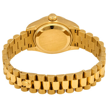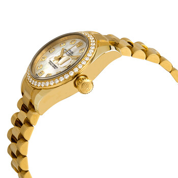 18k yellow gold case with a 18k yellow gold Rolex President bracelet. Fixed - 18k yellow gold diamond-set bezel. Mother of pearl dial with yellow gold-tone hands and diamond hour markers. Dial Type: Analog. Date display at the 3 o'clock position. Automatic movement. Scratch resistant sapphire crystal. Screw down crown. Case diameter: 26 mm. Round case shape. Concealed Crown clasp. Water resistant at 100 meters / 330 feet. Functions: date, hour, minute, second. Luxury watch style. Watch label: Swiss Made. Rolex Lady-Datejust 26 Mother Of Pearl Dial 18K Yellow Gold President Automatic Ladies Diamond Watch 179138MDP.