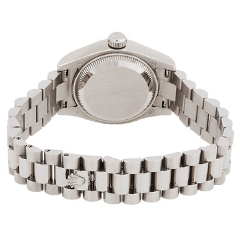 18k white gold case with a 18k white gold Rolex President bracelet. Fixed - fluted 18k white gold bezel. Silver dial with silver-tone hands and Roman numeral hour markers. Minute markers around the outer rim. Dial Type: Analog. Date display at the 3 o'clock position. Automatic movement. Scratch resistant sapphire crystal. Screw down crown. Solid case back. Case diameter: 26 mm. Round case shape. Concealed Crown clasp. Water resistant at 100 meters / 330 feet. Functions: date, hour, minute, second. Luxury watch style. Watch label: Swiss Made. Rolex Lady-Datejust 26 Silver Dial 18K White Gold President Automatic Ladies Watch 179179SRP.