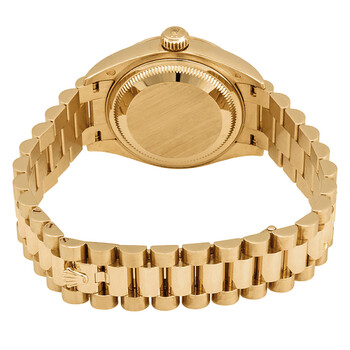 18k yellow gold case with a 18k yellow gold Rolex President bracelet. Fixed - fluted 18k yellow gold bezel. Champagne dial with yellow gold-tone hands and diamond hour markers. Minute markers around the outer rim. Dial Type: Analog. Date display at the 3 o'clock position. Automatic movement. Scratch resistant sapphire crystal. Screw down crown. Case diameter: 28 mm. Round case shape. Concealed Crown clasp. Water resistant at 100 meters / 330 feet. Functions: date, hour, minute, second. Luxury watch style. Watch label: Swiss Made. Rolex Lady-Datejust 28 Champagne Dial 18K Yellow Gold President Automatic Ladies Diamond Watch 279178CDP.