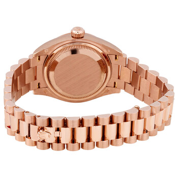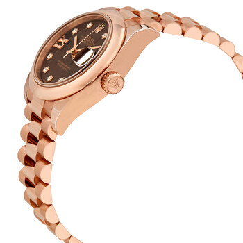 18k everose gold case with a 18k everose gold Rolex President bracelet. Fixed - domed 18k everose gold bezel. Chocolate dial with rose-gold tone hands and diamond with diamond-filled Roman numeral 9 hour markers. Dial Type: Analog. Date display at the 3 o'clock position. Automatic movement. Scratch resistant sapphire crystal. Screw down crown. Case diameter: 28 mm. Round case shape. Concealed Crown clasp. Water resistant at 100 meters / 330 feet. Functions: date, hour, minute, second. Luxury watch style. Watch label: Swiss Made. Rolex Lady-Datejust 28 Chocolate Dial 18K Everose Gold President Automatic Ladies Diamond Watch 279165CHRDP.