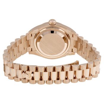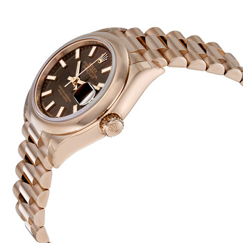 18kt everose gold case with a 18kt everose gold Rolex president bracelet. Fixed domed 18kt everose gold bezel. Chocolate dial with luminous rose gold hands and index hour markers. Minute markers around the outer rim. Dial Type: Analog. Luminescent hands and markers. Date display at the 3 o'clock position. Rolex calibre 2236 automatic movement, based upon Rolex 2235, containing 31 jewels, bitting at 28800 vph, and has a power reserve of approximately 55 hours. Scratch resistant sapphire crystal. Screw down crown. Solid case back. Round case shape. Case size: 28 mm. Concealed crown clasp. Water resistant at 100 meters / 330 feet. Functions: date, hour, minute, second, chronometer. Lady-datejust 28 Series. Luxury watch style. Watch label: Swiss Made. Rolex Lady-Datejust 28 Chocolate Dial 18K Everose Gold President Automatic Ladies Watch 279165CHSP.