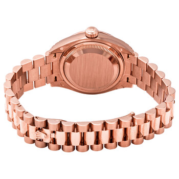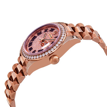 18kt everose gold case with a 18kt everose gold rolex predident bracelet. Fixed- diamond set bezel. Champagne dial with everose gold hands and Roman numeral hour markers. Dial Type: Analog. Date display at the 3 o'clock position. Rolex Calibre 2236 automatic movement with a 55-hour power reserve. Scratch resistant sapphire crystal. Screw down crown. Solid case back. Round case shape. Case size: 28 mm. Water resistant at 100 meters / 330 feet. Functions: date, hour, minute, second. Luxury watch style. Watch label: Swiss Made. Rolex Lady-Datejust 28 Dial Ladies 18kt Everose Gold Predident Watch 279135DRP.