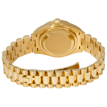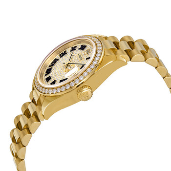 18kt yellow gold case with a 18kt yellow gold rolex president bracelet. Fixed- diamond set bezel. Diamond pave dial with rose gold-tone hands and Roman numeral hour markers. Dial Type: Analog. Date display at the 3 o'clock position. Rolex Calibre 2236 automatic movement. Scratch resistant sapphire crystal. Screw down crown. Solid case back. Round case shape. Case size: 28 mm. Water resistant at 100 meters / 330 feet. Functions: date, hour, minute, second. Luxury watch style. Watch label: Swiss Made. Rolex Lady-Datejust 28 Diamond-paved Dial Automatic Ladies 18kt Yellow Gold President Watch 279138DRP.